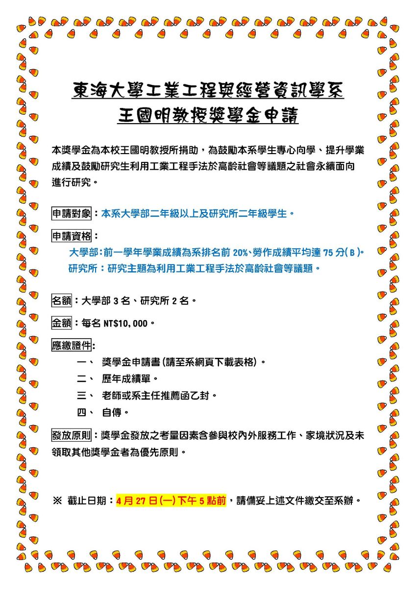 114學年度王國明教授獎學金~申請至4/27(一)止