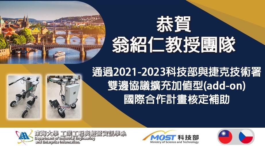 本校工業工程與經營管理學系教授翁紹仁帶領團隊通過2021-2023 科技部與捷克技術署雙邊協議擴充加值型(add-on)國際合作計畫核定補助,此次的國際合作案是屬於智慧醫療領域,其計畫研究重心是將人體感測監控模組應用於醫療康復運輸機器人中,所針對的目標產品,則是捷克De & Co Hranice s.r.o及ROBOTSYSTEM公司之MULTIROBOT (SMART WALKER)。這項產品在捷克方面已開發經年,其機電控制系統目前大致完備,但訊號處理、人工智慧之高階技術能力還略有不足,這方面可由台灣合作夥伴來協助。捷克有三家公司參與這次計畫,除提供產品原型的ROBOTSYSTEM公司之外,還有擅長運輸系統技術的PEŠEK Machinery s.r.o.公司。