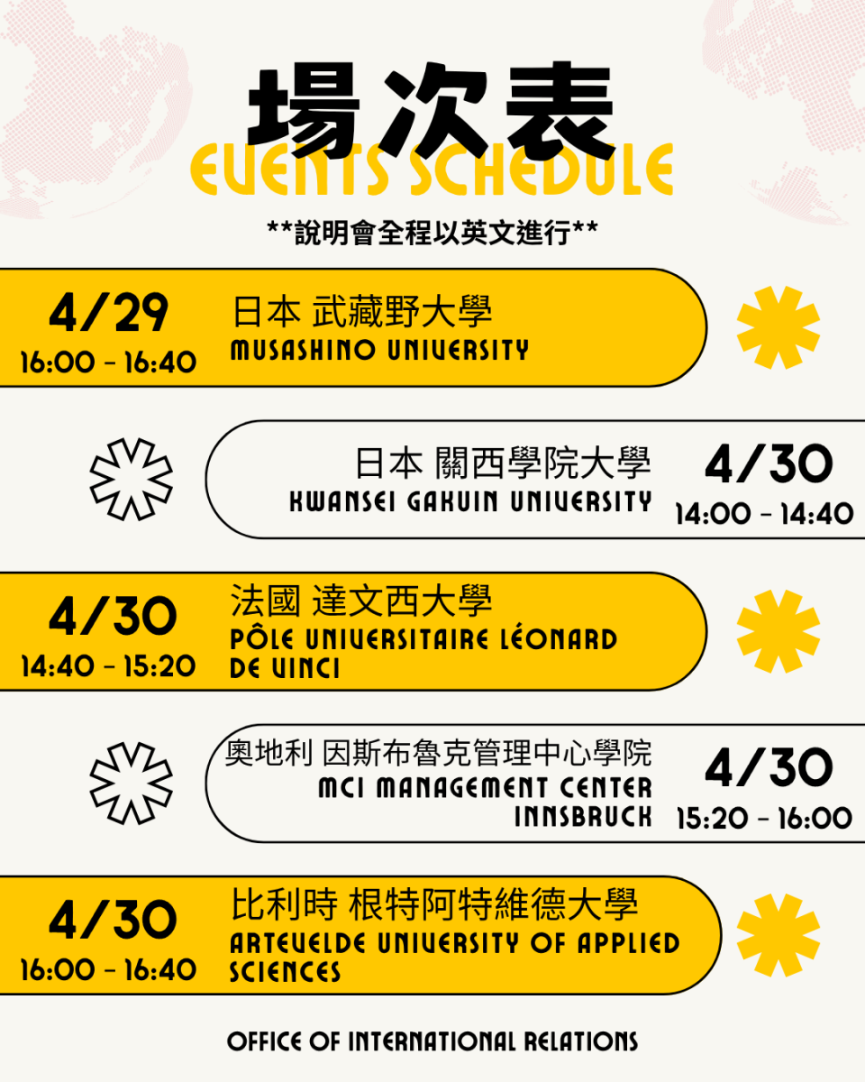 特別邀請姊妹校代表於線上介紹學校及國家背景特色,