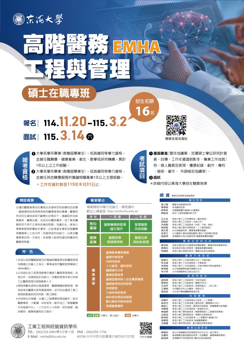 115學年度本系醫管碩士在職專班(EMHA)報名訊息-115/3/2中午截止報名