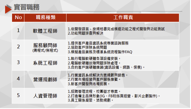 期望透過一學年的職場實習,強化學生實務執行能力,培養成為具有專業技能與實作經驗之人才,