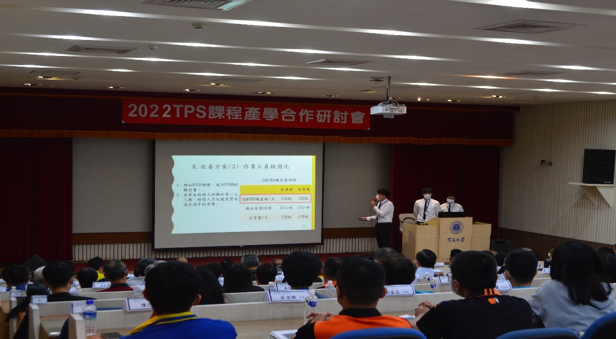 今年從7組產學合作中選出3組,進行成果報告,包含:久揚塑膠「精實化與自動化的相輔相成」、矽品精密「透過一人多工程與ECRS提升出貨區平衡率」、和昕精密「旋轉軸前段製程的消除浪費與流程平準化」。