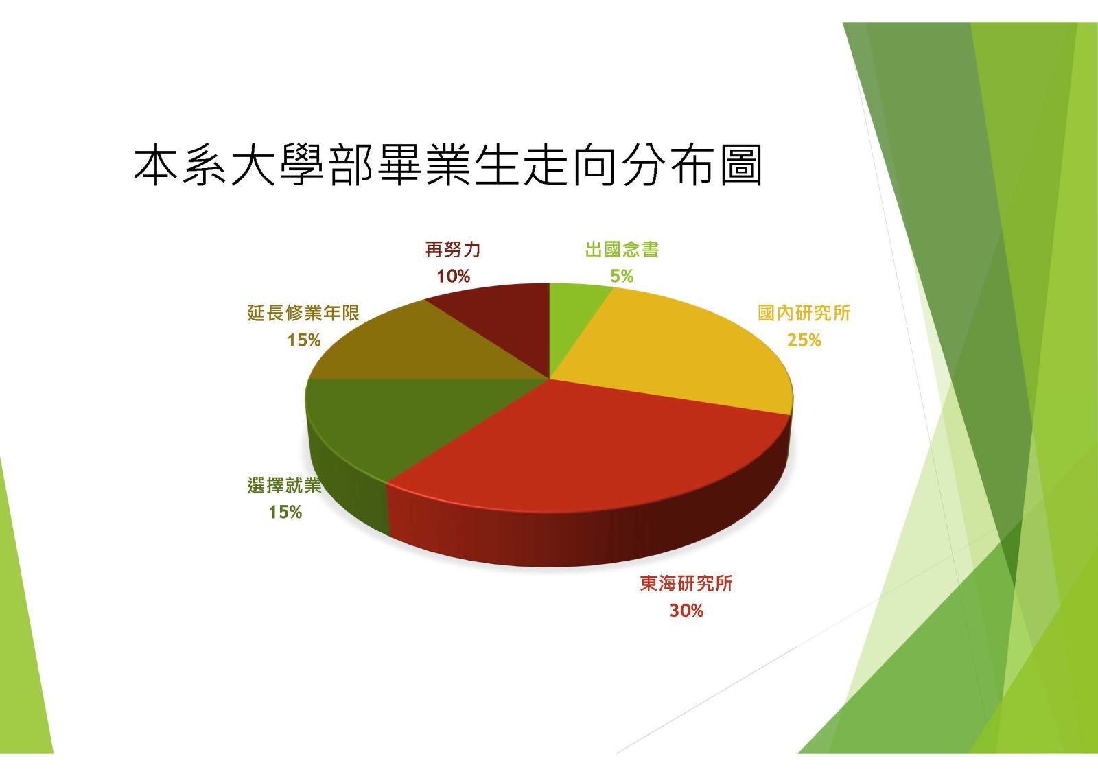 每年畢業生中大約六成左右繼續升學、兩成選擇直接就業、約兩成延長修業。
