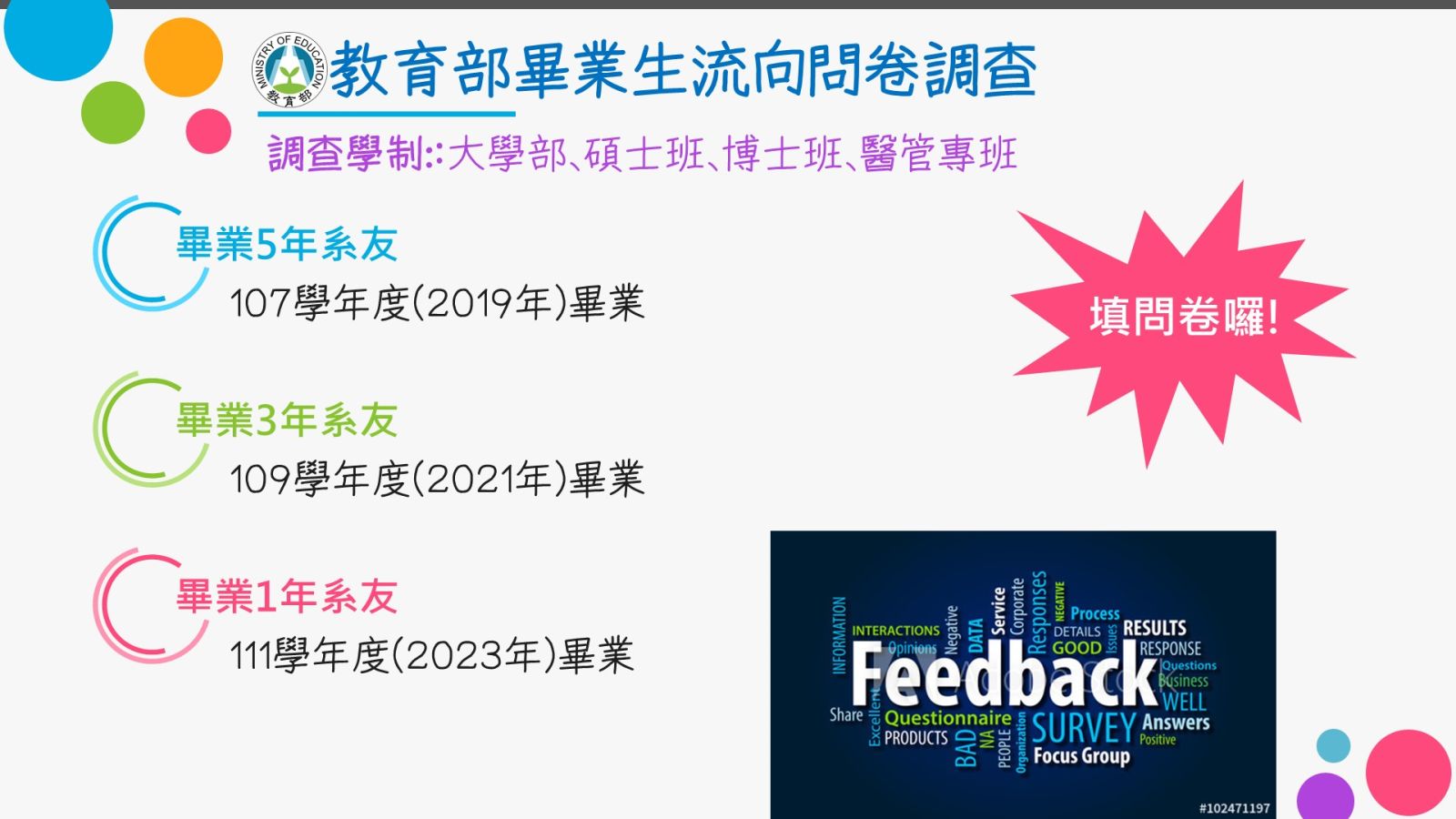 調查學制:大學部、碩士班、博士班、醫管專班