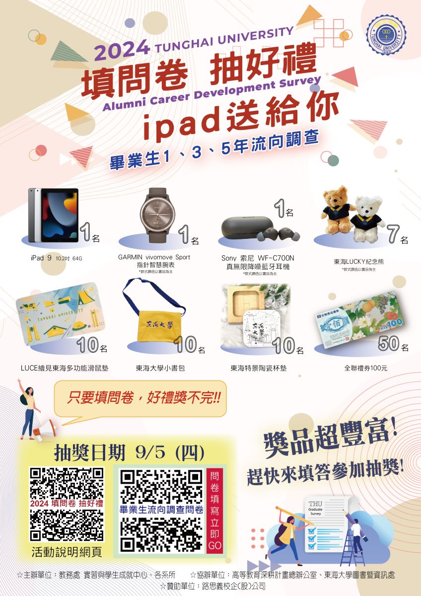 抽獎獎品包括iPad、GARMIN智慧腕錶、SONY 藍芽耳機、東海紀念熊、全聯禮券、東海小書包等獎品,填完問卷,好禮獎不完!! 9/4中午前,只要完整填寫所屬畢業生流向問卷,就可以參加抽獎。